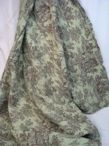 Ruffled Edges.100% Cotton.Celladon Color, Brown Print.Machine Washable.Size:65" x 85". Classic Toile print on celladon coarse accompanying brown print, ruffled aspects, reverses to brown and celladon stripes..